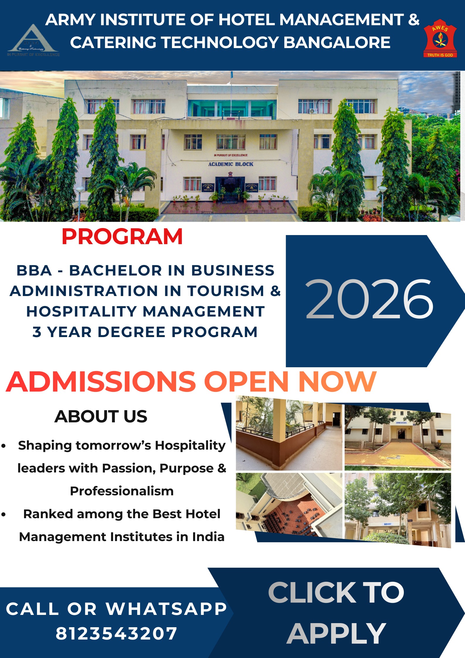 Established in 1996 under the Army Welfare Education Society (AWES), AIHM&CT offers world-class hospitality education exclusively for the wards of Indian Army personnel. Affiliated to Bengaluru North University and approved by AICTE, the institute is NAAC-accredited and renowned for its academic excellence.