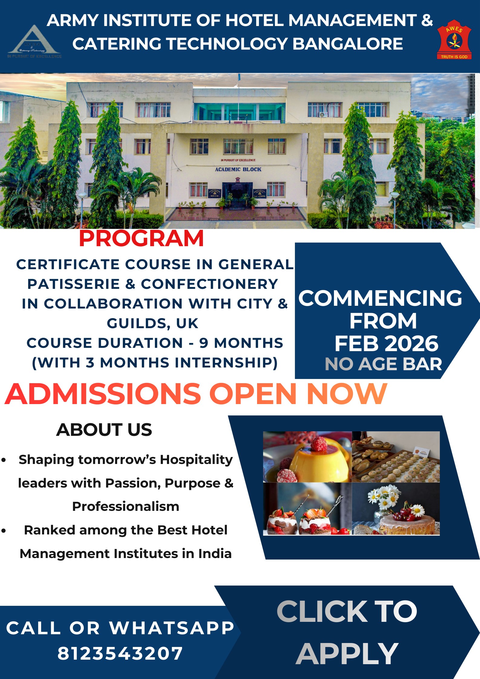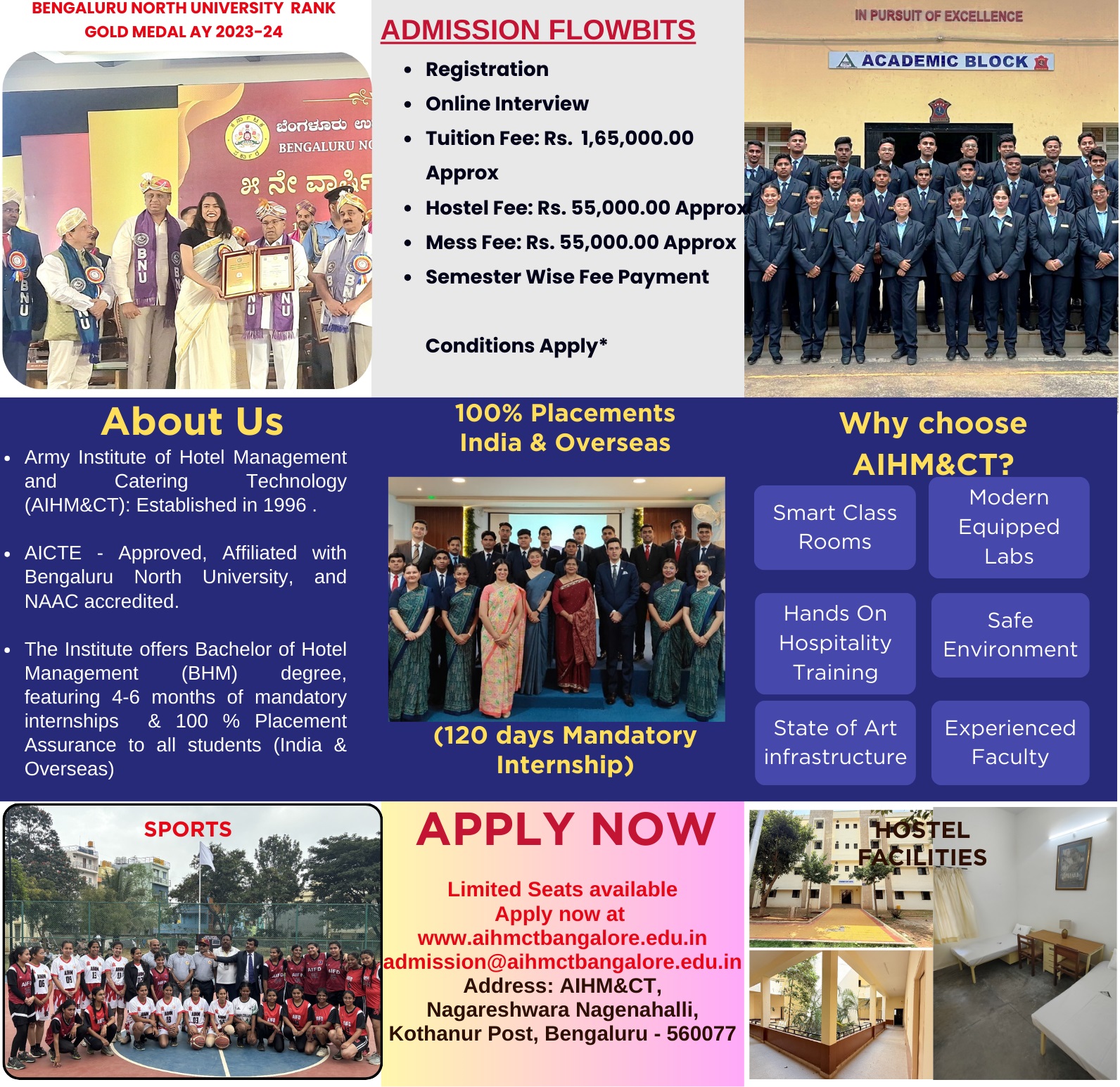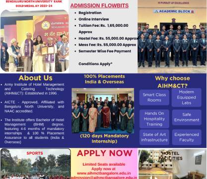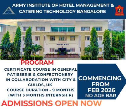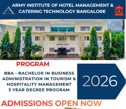 Established in 1996 under the Army Welfare Education Society (AWES), AIHM&CT offers world-class hospitality education exclusively for the wards of Indian Army personnel. Affiliated to Bengaluru North University and approved by AICTE, the institute is NAAC-accredited and renowned for its academic excellence.